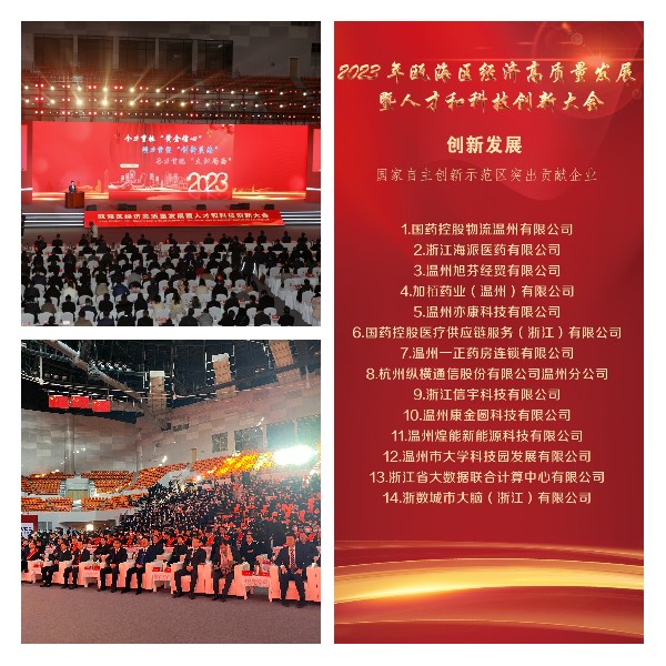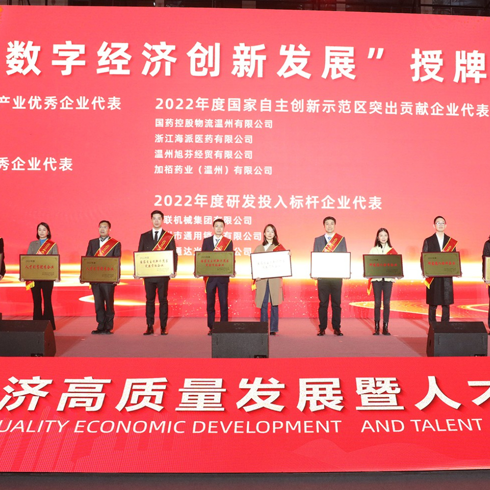 会上区委、区政府对2022年度重大人才工程获选代表、2022年度重大科技创新平台予以通报表扬。在“数字经济创新发展”授牌仪式上,由区政协金衍光主席颁发,温州旭芬经贸有限公司取得“2022年度国家自主创新示范区突出贡献企业”荣誉表彰。